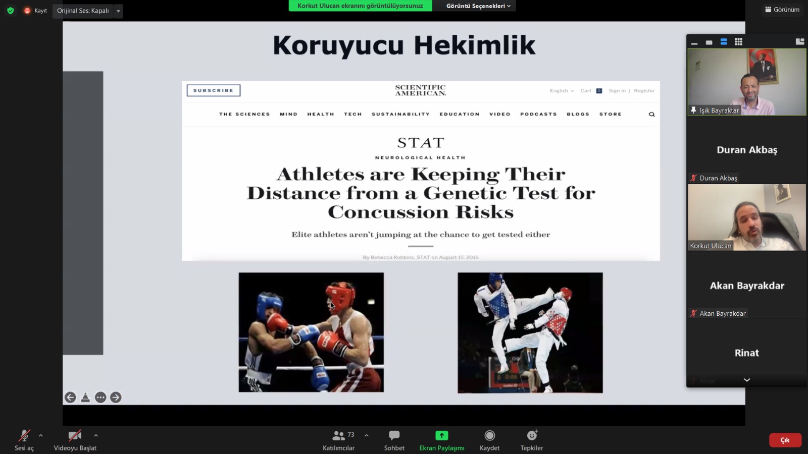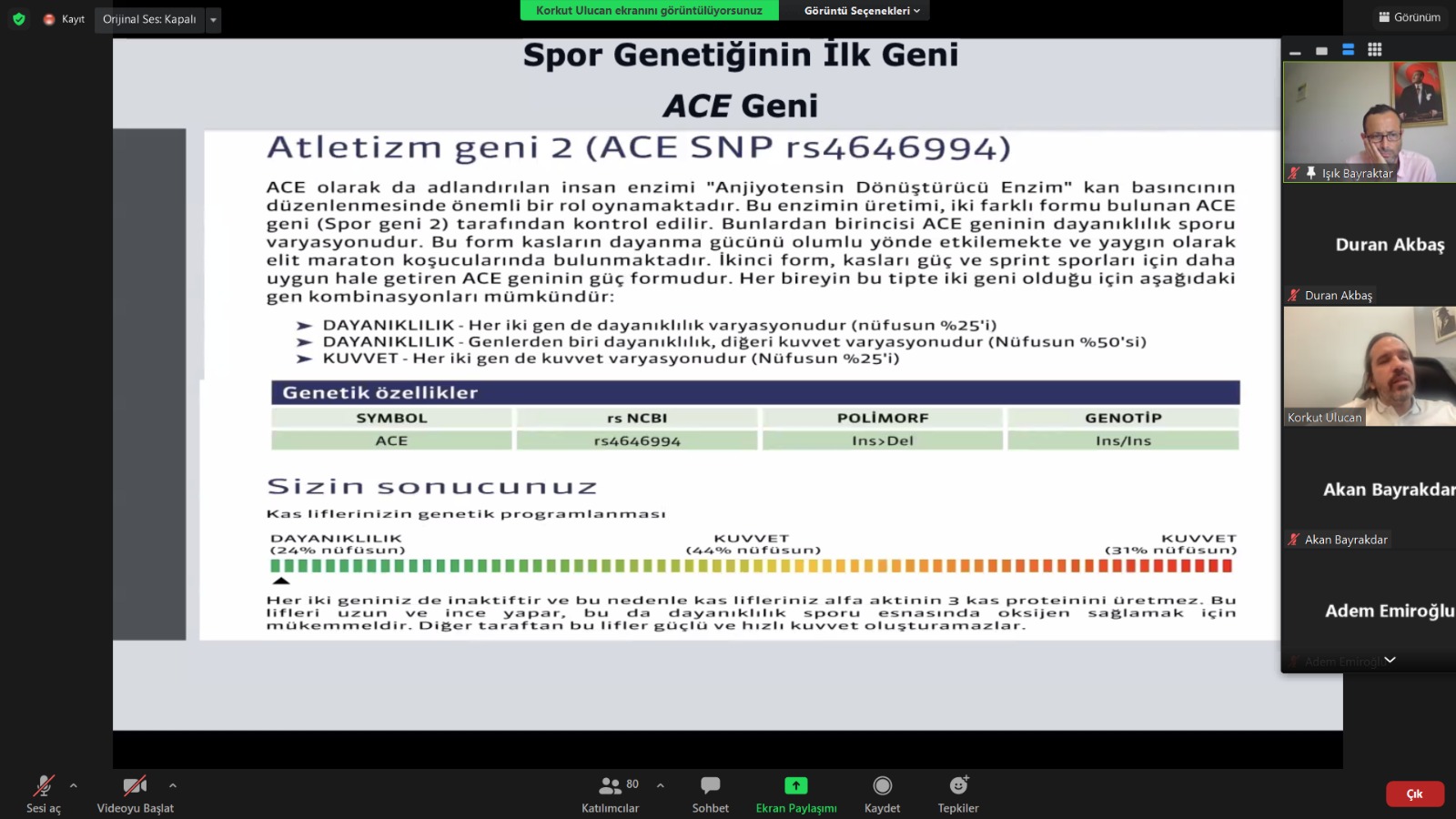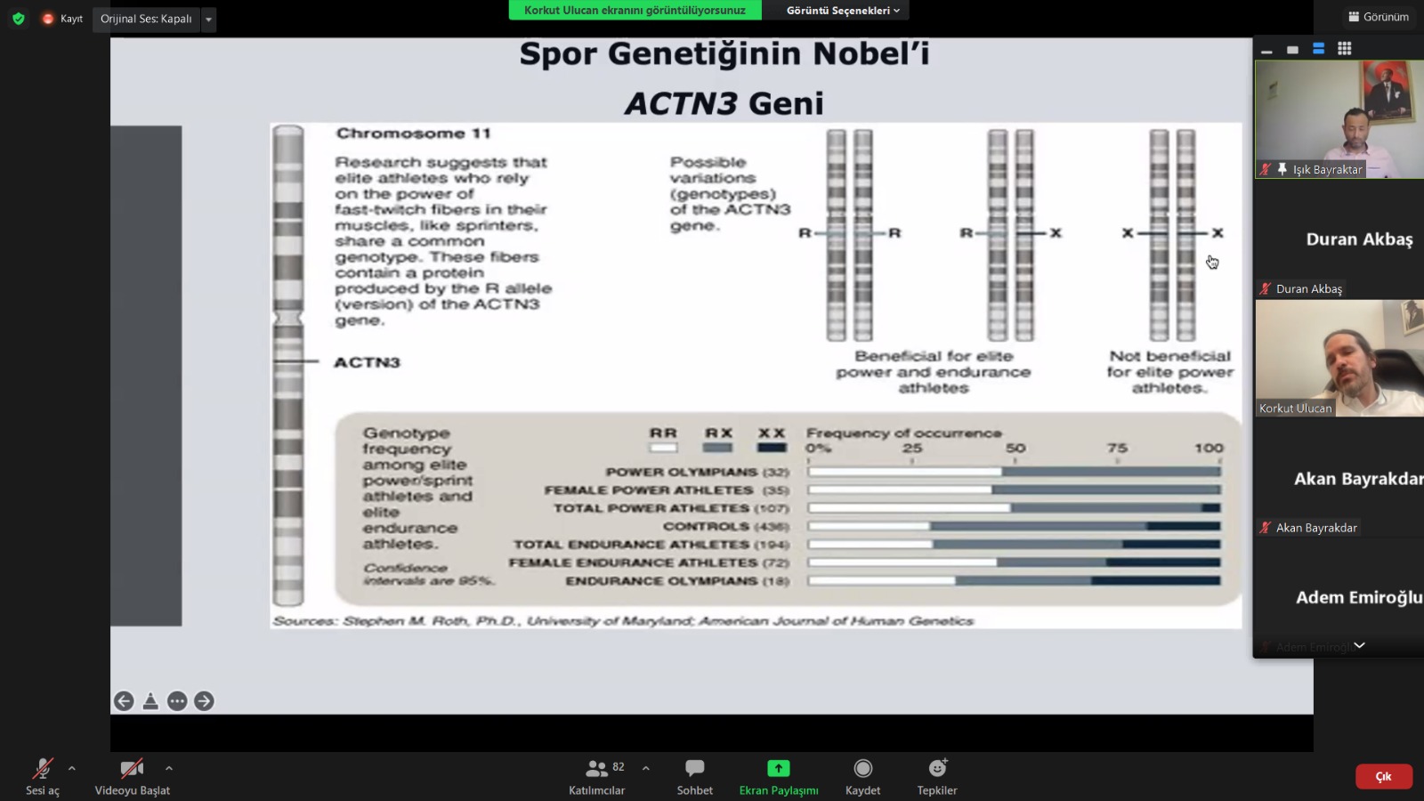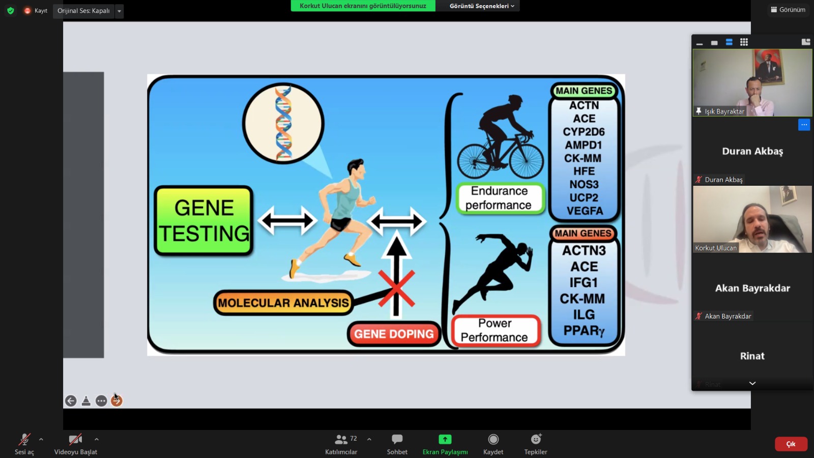 Genetik yapının bilinmesiyle sporcu performansının hangi yönleriyle etkileneceği anlatılan seminerin moderatörlüğünü merkez müdürü Doç. Dr. Işık Bayraktar yaptı. Öğretim elemanları, lisansüstü ve lisans öğrencilerinin katılımıyla gerçekleşen seminer soru-cevap bölümüyle tamamlandı.